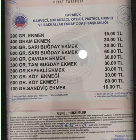 Karabük Kahveci Lokantacı Otelci Pastacı Fırıncı ve Bakkallar Esnaf Odasının yeni zamlar ile gram miktarlarında açıkladı…